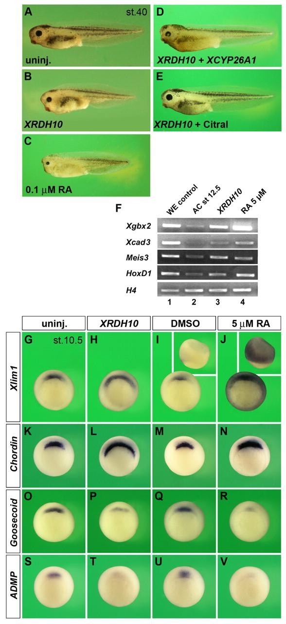 Fig. 4. XRDH10 induces retinoic acid signalling and differentially affects organizer gene expression. (A) Uninjected tadpole-stage embryo. (B) Animal injection of 4 ng XRDH10 mRNA at the four-cell stage induces a slight reduction of head structures and a shortening of the tail. (C) Treatment with 0.1 µM RA between stages 9 and 12 induces microcephaly and tail shortening. (D) Injection of 0.5 ng XCYP26A1 mRNA reverts the effect of XRDH10 mRNA and restores normal head and tail development. (E) Treatment with 4 µM citral at stages 9-12 abrogates the activity of XRDH10 mRNA. (F) RT-PCR analysis of animal caps explanted from stage 8 embryos and cultured until stage 12.5. Embryos were injected with 4 ng XRDH10 mRNA (lane 3) and animal caps treated with 5 µM RA (lane 4). Note that XRDH10 stimulates the transcription of all the RA target genes tested. (G-V) Whole-mount in situ hybridization of gastrula embryos in vegetal view. Insets depict lateral views. Embryos were injected in the margin of each blastomere at the four-cell stage with 1 ng XRDH10 mRNA (H,L,P,T) or treated from stage 8 onwards with DMSO as a control (I,M,Q,U) or 5 µM RA (J,N,R,V). Note that XRDH10 mRNA and RA expand the expression of Xlim1 and Chordin, but reduce the expression of Goosecoid and ADMP in the dorsal blastopore lip. Frequency of embryos with the indicated phenotypes was: B, 30/39; C, 25/25; D, 30/40; E, 29/39; G, 45/45; H, 19/39; I, 31/31; J, 41/41; K, 38/38; L, 29/43; M, 30/36; N, 16/29; O, 6/8; P, 4/6; Q, 22/28; R, 15/24; S, 14/14; T, 9/13; U, 64/69; V, 38/50. |