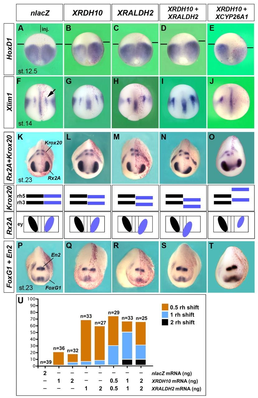 Fig. 5. Overexpression of XRDH10 and XRALDH2 results in an anteriorward shift of neural markers, whereas XCYP26A1 has the opposite effect. Whole-mount in situ hybridization of embryos after microinjection of mRNA into the animal pole of one dorsal blastomere at the four-cell stage. The lineage tracer nlacZ (red nuclei) labels the injected right-hand side. (A-E) Late gastrula embryos in dorsal view (anterior to the top). HoxD1 demarcates the ectoderm and mesoderm in the trunk with an anterior expression boundary at the level of rhombomere 4 (horizontal line). (F-J) Early neurula embryos in dorsal view, showing Xlim1 expression in two lines of neural cells (arrow). (K-O) Early tailbud embryos in anterior view (posterior to the top) and schematic overviews demarcating Rx2A expression in the eyes and Krox20 expression in rhombomeres 3 and 5 of the hindbrain. (P-T) FoxG1 labels the telencephalon, and En2 the midbrain-hindbrain boundary. (U) Synergistic effects of XRDH10 and XRALDH2 on hindbrain patterning. The anteriorward shift of Krox20 expression is shown in response to mRNA injections at the indicated doses. Note that XRDH10 has little effect on its own, but strongly enhances the posteriorizing effect of XRALDH2. nlacZ mRNA was injected as a control. Injected RNA amounts were (where not otherwise noted): nlacZ (300 pg), XRDH10 (1 ng), XRALDH2 (1 ng) and XCYP26A1 (0.5 ng). ey, eye; rh, rhombomere; R2, XRALDH2; R10, XRDH10. The indicated changes in gene expression were observed in: B, 35/78; C, 43/59; D, 18/29; E, 9/9; G, 24/96; H, 45/95; I, 30/51; J, 13/13; L, 7/36; M, 22/33; N, 22/33; O, 15/15; Q, 6/56 (En2); R, 7/19 (En2); S, 8/20 (En2); T, 25/25 (En2) embryos. |
