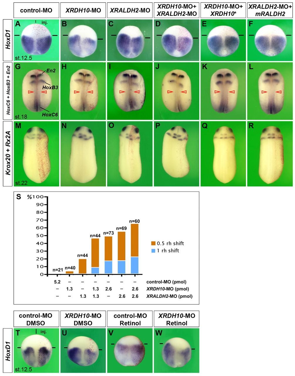 Fig. 8. XRDH10 contributes to CNS patterning and the posteriorizing effect of retinol. Morpholino oligonucleotides (MOs; each 2.6 pmol per embryo) were injected into the margin of one blastomere at the two-cell stage. The non-targeted mRNA constructs XRDH10* and mRALDH2 (each 1 ng) and the lineage tracer nlacZ mRNA were co-injected. Embryos are shown in dorsal view (anterior to the top). (A-F) Late gastrula embryos. XRDH10-MO, XRALDH2-MO, or a combination of both morpholinos, cause a reduction and posteriorward retraction of HoxD1expression, which is reverted by XRDH10* and mRALDH2 mRNA. (G-L) Neurula embryos showing expression of En2 (midbrain-hindbrain boundary), HoxB3 (hindbrain rhombomeres 5 and 6) and HoxC6 (anterior spinal cord). (M-R) Tailbud embryos depicting expression of Rx2A (eyes) and Krox20 (rhombomeres 3 and 5). (S) Effects of XRDH10 and XRALDH2 knockdown on hindbrain patterning. The posteriorward shift of Krox20 expression is shown in response to MO injections at the indicated doses. (T-W) Treatment with 100 µM retinol at stages 9-12 induces a robust anterior expansion of HoxD1 expression in late gastrula embryos (V). XRDH10-MO reverts the effect of retinol on the injected right-hand side (W). Frequency of embryos with the indicated phenotype was: A, 77/88; B, 55/105; C, 30/68; D, 54/88; E, 19/21; F, 23/25; G, 34/35; H, 17/31 (En2); H, 30/31 (HoxB3); H, 27/31 (HoxC6); I, 15/33 (En2); I, 31/33 (HoxB3); I, 32/33 (HoxC6); J, 6/9 (En2); J, 8/9 (HoxB3); J, 5/9 (HoxC6); K, 20/23; L, 39/39; M, 10/10; N, 35/73; O, 37/69; P, 38/60; Q, 10/10; R, 13/14; T, 9/9; U, 7/13; V, 9/9; W, 20/33 embryos. |