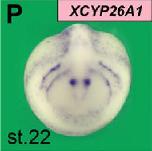 cyp26a1 (cytochrome P450, family 26, subfamily A, polypeptide 1 ) gene expression in Xenopus laevis embryos, NF stage 22, assayed by in situ hybridization, anterior view, dorsal up. |