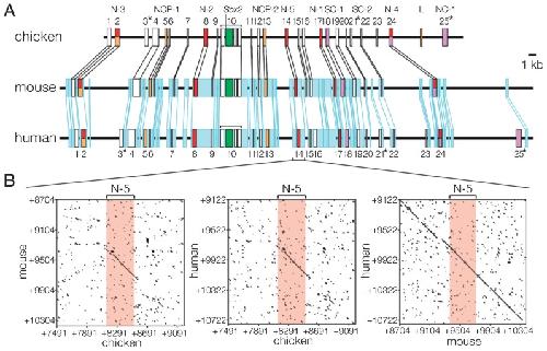 Fig. 4. Correspondence of the functionally defined Sox2 enhancers with blocks of highly conserved sequences found by comparison of chicken and mammalian Sox2 locus sequences. (A) Conserved sequence blocks found in the Sox2 locus sequences of amniotes. Blocks of sequences that show > 60% identity over the stretch of 100 base pairs are indicated by boxes. The 25 sequence blocks No. 1 to No. 25 conserved between chicken and mammalian sequences are indicated on the top. Blocks No. 3, 21 and 25 marked by asterisks are not conserved in the mouse sequence. Sequences conserved between human and mouse genomic sequences but not strongly conserved in the chicken sequence are indicated in blue. (B) Dot matrices comparing DNA sequences of the three animal sequences encompassing enhancer N-5 (conserved sequence block No. 14). A dot indicates a 10 bp sequence with > 60% matching. Between the chicken and mammalian sequences, only the enhancer sequence is significantly conserved, however between human and mouse, the enhancer sequence is embedded in a broader region of possibly non-functional sequence conservation. Adapted from Fig. 6 in Uchikawa et al. (2003). Functional analysis of chicken Sox2 enhancers highlights an array of diversity regulatory elements that are conserved in mammals. Dev. Cell 4, 509–519, with permission from Elsevier.