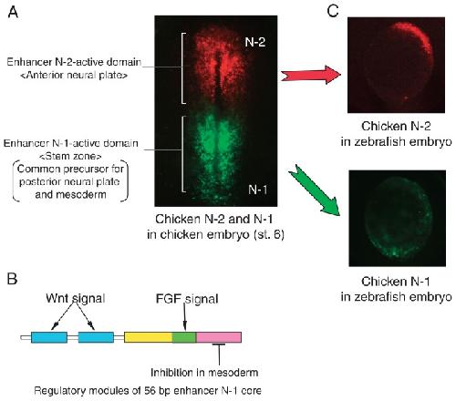 Fig. 5. Distinct characteristics of enhancers N-2 and N-1 that regulate Sox2 in anterior and posterior neural plates, respectively. A. In early stage chicken embryos, N-2 and N-1 are the only active Sox2 enhancers, covering un-overlapping anterior (N-2, red fluorescence of mRFP1) and posterior domains (N-1, green fluorescence of EGFP) of the developing CNS. B. Regulatory modules of enhancer N-1 core sequence determined by Takemoto et al.31) C. When a tk-mCherry vector carrying chicken enhancer N-2 was injected into zebrafish embryo, it was regulated to have activity in the anterior neural plate, whereas analogous tk-Venus vector carrying dimeric chicken N-1 was not activated with regional restriction.