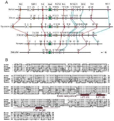 Fig. 6. Differential range of phylogenetic conservation of Sox2 enhancers. A. Comparison of highly conserved sequence blocks (boxes) and enhancers functionally assessed in higher vertebrates (colored boxes) among six animal species, human, mouse, opossum, chicken, Xenopus and zebrafish. Enhancers showing activity in the brain-forming anterior CNS are connected by red lines, while those in the posterior CNS are connected by blue lines. Most of the enhancers showing activity in the posterior CNS are conserved in amniotes, however conservation is limited in Xenopus and absent in fish. B. Alignment of enhancer N-1 sequences between five animal species. Although the entire sequence is highly conserved among amniotes, sequence conservation is limited to the core-proximal sequences in Xenopus; even in the core sequence only one Lef1 binding sequence among three essential functional elements31) is conserved in the Xenopus sequence.