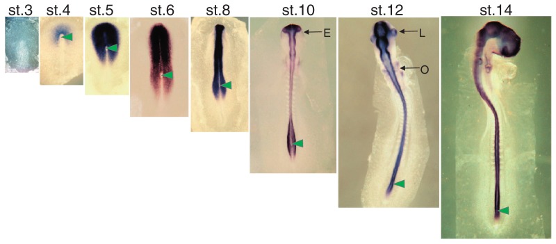 Fig. 1. Expression of Sox2 in chicken embryo at various developmental stages marking neural and sensory primordia, as indicated by in situ hybridization. Anterior is toward the top. Photographs were taken at the same scale. The position of organizer (Hensen’s node) is indicated by an arrowhead. Head ectoderm (E), lens placode (L) and otic vesicle (O) are indicated by arrows. Adapted from Fig. 1A in Uchikawa et al. (2003). Functional analysis of chicken Sox2 enhancers highlights an array of diverse regulatory elements that are conserved in mammals. Dev. Cell 4, 509–519, with permission from Elsevier.