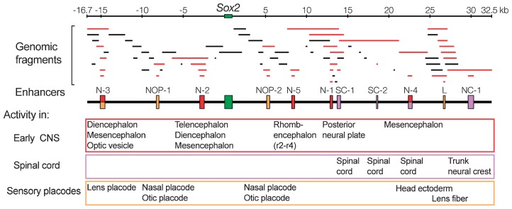 Fig. 2. Determination of Sox2 enhancers with activities in various and distinct domains of embryonic CNS and sensory placodes. Genomic fragments covering the 50 kb region of chicken Sox2 locus were individually tested for enhancer activity in electroporated chicken embryos. DNA fragments that demonstrated an enhancer activity are shown in red, and functionally determined enhancers are indicated by boxes on the map (middle). Adapted from Fig. 2 in Uchikawa et al. (2003). Functional analysis of chicken Sox2 enhancers highlights an array of diverse regulatory elements that are conserved in mammals. Dev. Cell 4, 509–519, with permission from Elsevier.