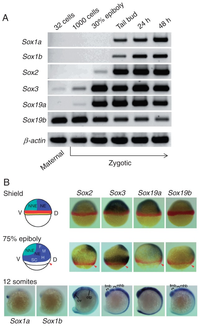 Fig. 7. Expression of group B1 Sox genes in early stage zebrafish embryos. A. RT-PCR analysis of transcripts of Sox1a, Sox1b, Sox2, Sox3, Sox19a and Sox19b in embryos at various stages. β-actin was used as control for the reaction. B. Expression pattern of the genes at various developmental stages indicated by in situ hybridization (blue). Hybridization with no tail probe (orange) was used to mark mesodermal precursors in gastrulating embryos. Developmental fates of early embryonic stages are illustrated for comparison: NNE, non-neural ectoderm; NE, neural ectoderm; D, dorsal; V, ventral; F, forebrain; M, midbrain; H, hindbrain; SC, spinal cord. Arrowheads indicate the site of shield. In 12-somite stage embryos, optic vesicle (ov), otic placode (otp), fore-midbrain boundary (fmb) and mid-hindbrain boundary (mhb) are indicated. Reprinted from Figs. 3, 4 and 6A in Okuda et al. (2006). Comparative genomic and expression analysis of group B1 sox genes in zebrafish indicates their diversification during vertebrate evolution. Dev. Dyn. 235, 811â825, with permission from Wiley-Blackwell.