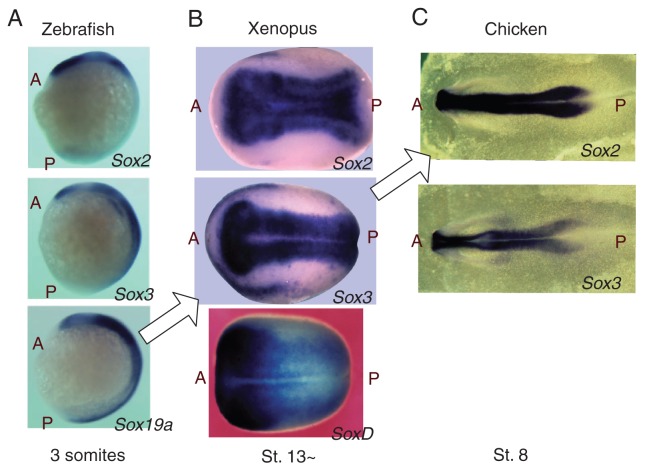 Fig. 9. Evolutionary shift of the major “pan-neural” group B1 Sox genes and of posterior coverage of the CNS by Sox2, Sox3 and Sox19 paralogues, as indicated by expression patterns in embryos at comparable developmental stages. (A) Expression pattern in zebrafish embryo of 3 somite stage. Sox19a is the most prevalent, while strong Sox2 expression is mostly confined to the anterior CNS, as in other stages (Fig. 7). Reprinted from Fig. 5B in Okuda et al. (2006). Comparative genomic and expression analysis of group B1 sox genes in zebrafish indicates their diversification during vertebrate evolution. Dev. Dyn. 235, 811–825, with permission from Wiley-Blackwell. Reported Sox3 expression pattern in medaka embryo is analogous to zebrafish.46) (B) Expression pattern in Xenopus embryos at stage 13 and later, where Sox3 is the major Sox gene expressed. Expression patterns of Sox2 and Sox3 are reproduced from Fig. 1 of Schlosser and Ahrens (2004). Molecular anatomy of placode development in Xenopus laevis. Dev. Biol. 271, 439–466, and that of SoxD is reproduced from Fig. 2 of Mizuseki et al. (1998). SoxD: an essential mediator of induction of anterior neural tissues in Xenopus embryos. Neuron 21, 77–85, with permission from the authors and Elsevier. (C) Expression pattern in chicken embryo at stage 8, where Sox2 expression is dominating. In the chicken, Sox19-paralogous gene has not been identified. Arrows indicate the shift of major group B1 Sox among the species. A and P indicate anterior and posterior, respectively.