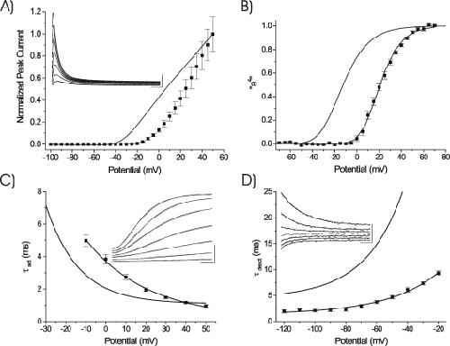 Figure 1. Activation and Deactivation Characteristics.A) Main Panel: Comparison of normalized (peak values at +50 mV) mean peak transient I–V relationships for V287R (n = 8) and WT Kv4.3, from [16]. HP = −100 mV, currents elicited by one second depolarizing pulses, and mean peak transient current defined as peak current minus residual current at the end of the depolarizing pulse. V287R mean peak current amplitude at +50 mV = 903±141 nA. Inset: Representative current waveforms for V287R elicited in response to depolarizing voltage clamp pulses applied from −10 mV to +50 mV, 10 mV increments. Calibration bar: 200 nA, 50 ms. B) Mean steady-state activation curve “a4” fit as a fourth order Boltzmann relationship (V1/2 = 1.40 mV, k = 11.62 mV, n = 11). Mean WT “a4” relationship: V1/2 = −36 mV, k = 14.50 mV, from [9]. C) Main Panel: V287R activation kinetics (n = 11). Curve fits (single exponential functions) to mean data points: τact = 4.84e10−mV/30.9+0.20 ms. Inset: Representative fits of V287R “a4” activation kinetics elicited during depolarizing pulses from −10 to +50 mV, 10 mV increments, HP = −100 mV. τact = 1.1, 1.4, 1.9, 2.5, 4.2, 5.2, 7.7 ms, −10 to +50 mV, respectively. Calibration bar: 200 nA, 1.0 ms. D) Main Panel: V287R deactivation kinetics (n = 12). Curve fits (single exponential functions) to mean data points: τdeact = 0.18emV/32.7+1.40 ms. Inset: Representative single exponential fits of V287R deactivation kinetics from −40 to −100 mV, 10 mV increments, HP = −100 mV. τdeact = 4.9, 3.9, 3.6, 2.7, 2.8, 2.2 ms, −40 to −100 mV, respectively, −70 mV not fit. Calibration bar: 50 nA, 3.0 ms. WT data in panels C) and D) from [9]. |