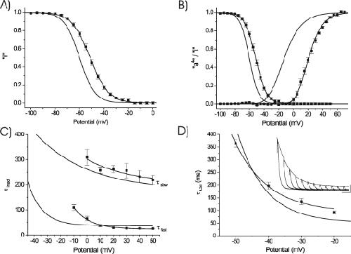 Figure 2. Inactivation Characteristics.A) Isochronal one second inactivation relationship “i”. Mean data points (n = 13) fit to a single Boltzmann relationship (V1/2 = −51.50 mV, k = 7.26 mV). WT data (V1/2 = −60.10 mV, k = 6.20 mV) from [9]. B) Comparative overlays of “a4” and “i” relationships for WT and V287R channels. Both expression conditions displayed significant closed-state inactivation, with V287R stabilizing non-inactivated closed states. The mutant channel also produced a greater depolarizing shift in “a4” than in “i”. C) V287R mean τinact−Vm curves (n = 12). Curve fits: τfast = 86.20e10−mV/12.23+23.50 ms; τslow = 99.70e10−mV/33.97+201.90 ms. WT data from [10]. D) Main Panel: V287R kinetics of closed-state inactivation. A fixed one second pulse to +50 mV (P2) was preceded by a pulse of progressively increasing duration (P1) at each of the potentials indicated. The decline of P2 current as a function of P1 duration was used to determine τcsi. V287R curve fit: τcsi = 725.68e−60+mV/10.23+91.50 ms. WT data from [25]. Inset: Development of CSI at −40 mV for V287R, τcsi = 202 ms. Calibration Bar: 100 nA, 150 ms. |