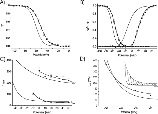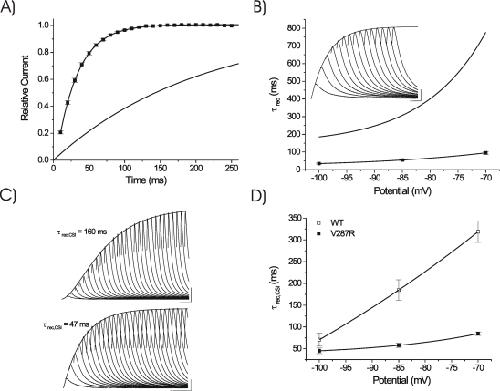 Figure 3. Recovery Characteristics.A) WT and V287R macroscopic recovery kinetics (HP = −100 mV) developed during a one second pulse to +50 mV. Mean mutant data points (n = 7) fit as a single exponential function with τrec = 30.10 ms. WT τrec = 206 ms, data from [9]. B) Main Panel: Comparison of the voltage dependence of mean τrec values of V287R and WT, from [9], [10], [16], [25]. At all HPs, macroscopic recovery kinetics were significantly faster for V287R than for WT. Curve fits: WT: τrec = 23.89emV/11.14+142.10 ms, V287R: τrec = 9.42emV/21.77+13.95 ms. Inset: Representative macroscopic recovery waveforms for V287R (P2 currents at +50 mV). Peak data points fit with a single exponential relationship with time constant = 32 ms. Calibration bar: 200 nA, 20 ms. C) Representative recordings of recovery (HP = −85 mV) from closed-state inactivation for WT (upper panel, fit as an “a2” formulation) and V287R (lower panel, exponential fit). Calibration bars: WT: 1 µA, 50 ms, V287R: 500 nA, 50 ms. D) Voltage dependence of mean τrec,csi values for WT (hollow squares, n = 5) and V287R (solid squares, n = 7). Curve fits: WT: τrec,csi = 248.50emV/93.1−582.10 ms, V287R: τrec,csi = 5.80emV/19.77+34.10 ms. |