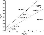 Figure 4. Summary of all Kv4.3 S4 mutant data collected to date: “i” V1/2 values as a function of “a” V1/2 values.The solid black line (centered on WT) is a linear relationship with slope = 1.0, as predicted from previous work on Shaker channels [26]. The solid gray line is a best fit to all mutant data points (WT excluded, slope = 0.65, mean R→A/Q data points from [9], [10]). All ΔV1/2 shifts were less than those predicted from Shaker. |