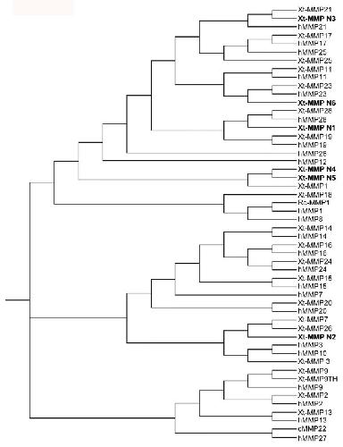 Figure 6. Comparison of MMP N2 with MMP7 and MMP26. Note that like human and Xenopus MMP7 and MMP26, MMP N2 lacks the linker peptide and hemopexin-like domain at the C-terminal. See Fig. 2 for other information.