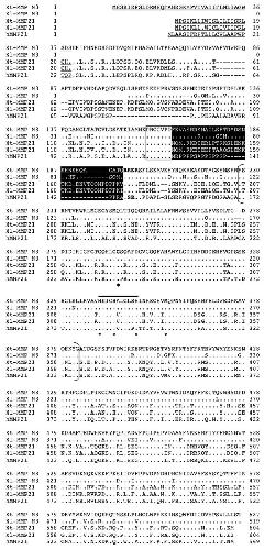 Figure 5. Comparison of MMP21 with MMP N3. The predicted signal peptide is underlined and the putative furin recognition sequences within the propeptide are in bold. The sequence in white on dark background indicates the unique insertion in the propeptide in MMP21. A unique cysteine residue in the catalytic domain is in bold and indicated with a black diamond below. Note that the sequence for Xl-MMP N3 is incomplete at the N-terminus. See Fig. 2 for other information.