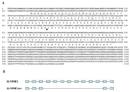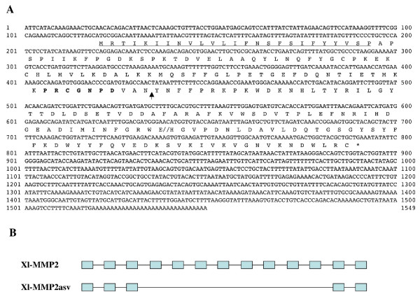 Figure 7. Putative alternative splicing variant of X. laevis MMP2 (MMP2asv). A) Nucleotide and deduced amino acid sequences of MMP2asv. The protein contains, from the N-terminus to C-terminus, a signal peptide (underlined), the conserved sequence in the propeptide involved in the cysteine-switch (in bold letters), a truncated catalytic domain linked to a truncated hemopexin domain (separated by double slash lines). The predicted cleavage site between the propeptide and the catalytic domain is indicated by an arrow. B) Comparison of the full length and alternatively spliced X. laevis MMP2 exon/intron organization. Solid blocks stand for exons present in the mRNAs and lines are introns.