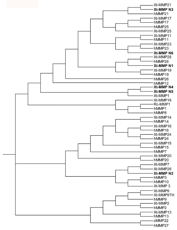 Figure 1. Phylogenetic tree of X. tropicalis (Xt) and human MMPs. Also included are chicken MMP22 (cMMP22) and Rana catesbeiana MMP1 (Rc-MMP1) as MMP22 was not found in human and Xenopus and Rc-MMP1 has a unique sequence organization (see description on MMP1). Novel X. tropicalis MMPs are highlighted in bold.