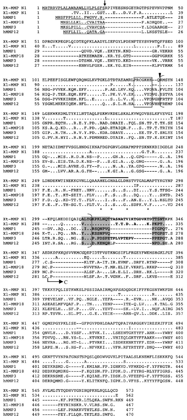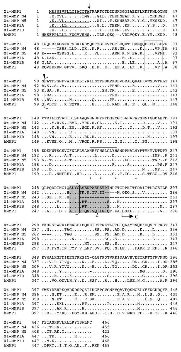 Figure 2. Sequence comparison of MMP1 with MMP N4 and MMP N5. X. tropicalis (Xt) MMP1, N4 and N5, and X. laevis (Xl) MMP1A and 1B were aligned with human (h) MMP1 for comparison. The sequences of the putative signal peptide are underlined. The predicted cleavage site between the signal peptide and the propeptide is indicated by an arrow, and the predicted cleavage site between the propeptide and the catalytic domain is indicated by solid arrowhead. The conserved sequence in the propeptide involved in the cysteine-switch is boxed, and the zinc-binding motif within the bracketed catalytic domain is indicated by a solid line on top. The three conserved histidine residues in the zinc binding motif and the conserved methionine residue of the nearby Met-turn are indicated by stars below. The 16 aa sequence (shadowed) at the end of the catalytic domain (bracketed) indicates the region whose integrity is important for collagenase specificity for collagen. An insertion of 8 or more aa within this region at the site indicated by an arrowhead is characteristics of stromelysins. The arrow marked C shows the beginning of the C-terminal hemopexin-like domain. A dot indicates an identical amino acid as the corresponding one in Xt-MMP1. Gaps (dashes) are introduced to optimize the alignment among proteins. Note that MMP N4 and N5 contain internal deletions in the linker region between the catalytic domain and C-terminal hemopexin-like domain.