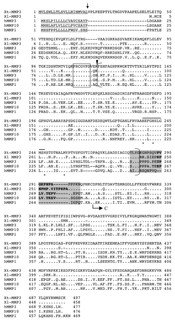 Figure 3. Comparison of Xenopus MMP3 with human MMP1, 3, and 10. Note that the shadowed region at the end of the catalytic domain corresponds to the same region in Fig. 2 except the insertion of 8–14 aa in stromelysins (MMP3, 10) compared to collagenases (e.g., the MMP1 shown here). See Fig. 2 for other information.