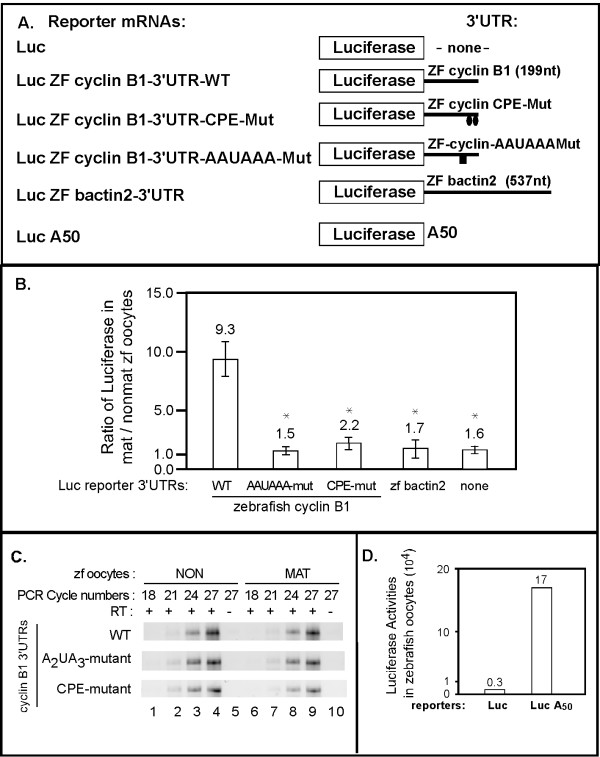 Figure 3. The 3'UTR of zebrafish cyclinB1 mRNA is sufficient to activate translation during zebrafish oocyte maturation and this activation requires the CPE and AAUAAA sequences. (A) Schematic of various luciferase reporter mRNAs with different 3'UTRs (ZF-zebrafish). (B) The zebrafish cyclin B1 3'UTR directs translational activation during oocyte maturation and activation requires the putative CPE elements and AAUAAA element. Luciferase reporter mRNAs with various zebrafish cyclinB1 3'UTRs were injected into oocytes. Some of the injected oocytes were matured. Luciferase activity was measured in extracts prepared from injected oocytes and injected matured oocytes. The ratio of luciferase in matured versus non-matured oocytes was plotted for comparison. The mat/non-mature ratios shown are represented as mean +/- SEM of at least three independent experiments. Statistical analysis (P values) was performed by one-way ANOVA. * P < 0.05. Each reporter containing zebrafish cyclin B1 mutant 3'UTR, bactin2 3'UTR or no 3'UTR was compared to the reporter with zebrafish cyclin B1 WT 3'UTR. (C) Luciferase reporters were equally stable in mature vs. non-mature oocytes. Total RNA was extracted from mature and non-matured oocytes injected with each zebrafish cyclin B1 3'UTR reporter mRNA. Equal amounts of total RNA from each sample were utilized in quantitative RT-PCR using luciferase-specific primers. Product formation was monitored with increasing cycles of amplification and analyzed by agarose gel electrophoresis. (D) The presence of a poly (A) tail is sufficient to stimulate mRNA translation in zebrafish oocytes. Luciferase reporter mRNAs (Luc vs. LucA50) were injected into 20–30 fully-grown zebrafish oocytes and assayed for luciferase activity after 6 hours. This experiment was repeated twice and shown here are the absolute values of luciferase activity from one representative experiment.