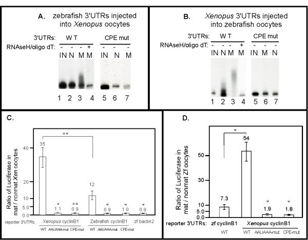 Figure 4. Directing polyadenylation and activating translation during oocyte maturation are evolutionarily conserved functions of cyclin B1 3'UTRs. (A) The zebrafish cyclinB1 3'UTR is sufficient to direct polyadenylation during Xenopus oocyte maturation, and the CPEs are required. Each P32-labeled 3'UTR RNA was injected into 30–50 Xenopus oocytes and some oocytes were matured. RNA isolated from injected non-mature oocytes or injected matured oocytes were analyzed by 4% denaturing PAGE. IN: Uninjected RNA. N: RNA from non-mature oocytes. M: RNA from mature oocytes. Half of the RNA from WT 3'UTR injected mature oocytes was treated with oligo dT/RNaseH prior to analysis (lane 4). The size reduction after oligo dT/RNaseH treatment (lane 4 versus lane 3) indicated that the WT 3'UTR RNA was polyadenylated. (B) The Xenopus cyclinB1 3'UTR is sufficient to direct polyadenylation during zebrafish oocyte maturation, and the CPEs are required. Each P32-labeled 3'UTR RNA was injected into 50–100 zebrafish oocytes and some oocytes were matured. RNA from injected non-matured oocytes or injected matured oocytes were analyzed by 4% denaturing PAGE. IN: Uninjected RNA. N: RNA from non-mature oocytes. M: RNA from mature oocytes. Half of the RNA extracted from WT 3'UTR injected matured oocytes was treated with oligo dT/RNaseH prior to analysis (lane 4). The size reduction after oligo dT/RNaseH treatment indicated that the WT 3'UTR RNA was polyadenylated (compare lanes 3 and 4). (C) The zebrafish cyclinB1 3'UTR is sufficient to activate translation during Xenopus oocyte maturation and the AAUAAA and CPE sequences are required for this activation. Luciferase reporter RNAs with various 3'UTRs were injected into 30–40 Xenopus oocytes and half were matured with progesterone. The ratios of luciferase activities from mature vs. non-mature oocytes were calculated and graphed as mean +/- SEM from at least three independent experiments. Statistical analysis was performed by one-way ANOVA. * P < 0.05, ** P < 0.01. Each Xenopus mutant 3'UTR was compared to Xenopus WT 3'UTR, each zebrafish mutant cyclin B1 3'UTR or WT bactin2 3'UTR was compared to zebrafish WT cyclin B1 3'UTR. The mature/non-mature ratio of Xenopus cyclin B1 3'UTR is significantly different from that of zebrafish cyclin B1 3'UTR (D) The Xenopus Cyclin B1 3'UTR is sufficient to activate translation during zebrafish oocyte maturation and the AAUAAA and CPE sequences are required for this activation. Luciferase reporter RNAs with various 3'UTRs were injected into 50–100 zebrafish oocytes and half were matured with hormone. The ratio of luciferase activities from mature versus non-mature oocytes were calculated and graphed as the mean values +/- SEM from at least three independent experiments. Statistical analysis was performed by one-way ANOVA. * P < 0.05. Each mutant Xenopus reporter was compared to WT Xenopus reporter. The mature/non-mature ratio of zebrafish cyclin B1 3'UTR is significantly different from that of Xenopus cyclin B1 3'UTR.