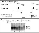 Figure 1. The endogenous zebrafish cyclinB1 mRNA is polyadenylated during oocyte maturation and early embryogenesis. (A) Diagram of oligonucleotide/RNaseH treatment for analysis of mRNA poly (A) tails. i.) RNA samples were hybridized to a DNA oligonucleotide complementary to a region of the open reading frame close to the 3'UTR. Half of each sample was also hybridized to oligo/dT. ii.) Treatment with RNaseH cleaved the RNA in the region of the RNA/DNA hybrid. In the sample with oligo/dT RNaseH cleaved the poly (A) tail. iii.) Treated RNA samples were analyzed by high resolution RNA blot hybridization and the sizes of the 3'UTR fragments with and without poly (A) indicates the length of poly (A) tail present. (B) Analysis of the endogenous zebrafish cyclinB1 mRNA 3'UTR following oligonucleotide/RNaseH treatment. Total RNAs from zebrafish oocytes, mature oocytes and two-cell embryos were hybridized with a DNA oligonucleotide complimentary to the zebrafish cyclin B1 mRNA's 3'UTR nucleotides -393 to -372 relative to poly(A) addition site at +1. Half of each sample was also hybridized with oligo dT (lanes 1, 3, 5). All samples were then treated with RNaseH and analyzed by RNA blot hybridization using a radio labeled probe corresponding to the 3'UTR of zebrafish CyclinB1 mRNA (-199 to +1). The positions of RNA markers are indicated.