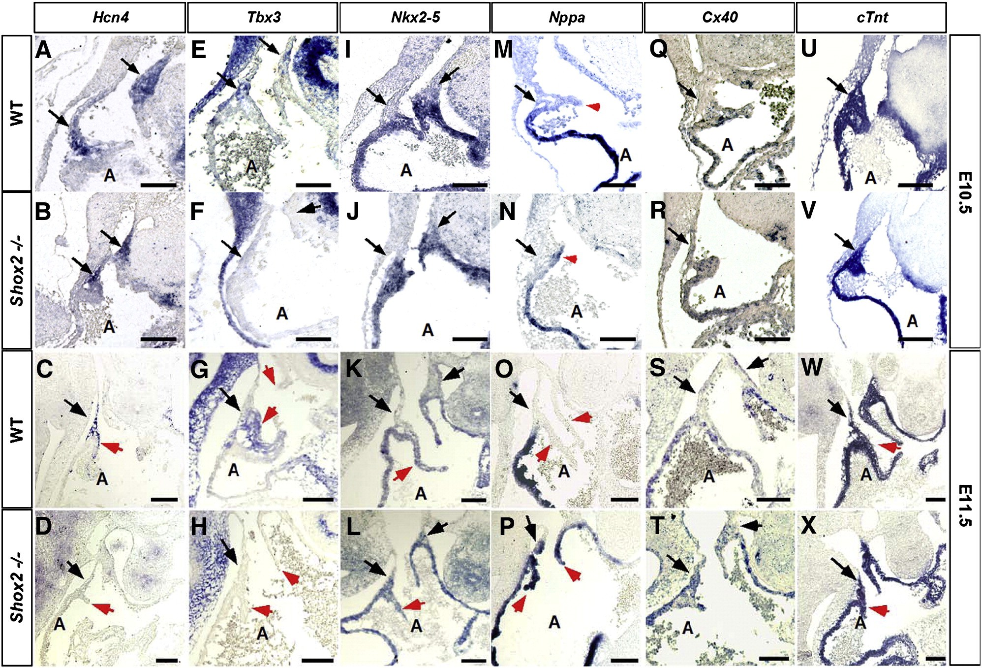 Fig. 3. Altered gene expression in the Shox2â/â heart. Expression patterns of Hcn4 (AâD), Tbx3 (EH), Nkx2-5 (IâL), Nppa (MâP), Cx40 (QâT) and cTnt (UâX) at E10.5 and at E11.5 in the wild type and Shox2â/â hearts are shown. Hcn4 is expressed in the dorsal right wall of the right atrium in the wild type (A, C) and is reduced or absent in the Shox2 mutant (B, D). Tbx3 is expressed in the dorsal right wall of the right atrium and in the sinus valves (E, G), however is absent in the Shox2 mutant (F, H) at both stages. Nppa, Cx40, and Nkx2-5 are ectopically expressed in the dorsal right wall of the Shox2â/â right atrium at both stages (J, N, R, L, P, T), as compared to the wild type controls (I, M, Q, K, O, S). cTnt shows comparable expression level in the Shox2â/â heart (V, X) and the wild type controls (U, W). In all panels, the arrows point to the SAN region, while the arrowheads point to the sinus valves. A, atrium. Scale bars represent 50 μm.