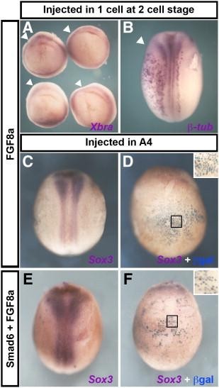 Fig. 4. BMP inhibition together with FGF8a does not induce neural marker expression in Xenopus. (AâB) Injection of FGF8a into one cell at the two-cell stage does not alter Brachyury expression at the gastrula stage (A) but does expand β-tubulin expression at the neurula stage (B); arrowheads indicate the injected side. (CâF) Injection of FGF8a into an A4 blastomere, alone (C, D) or in combination with the BMP inhibitor Smad6 (E, F) does not induce Sox3 expression in ventralepidermis. A: vegetal view; B, C and E are dorsal views; D and F are ventral views of the embryos to their left. Black squares show the area enlarged in the inset in panels D and F.