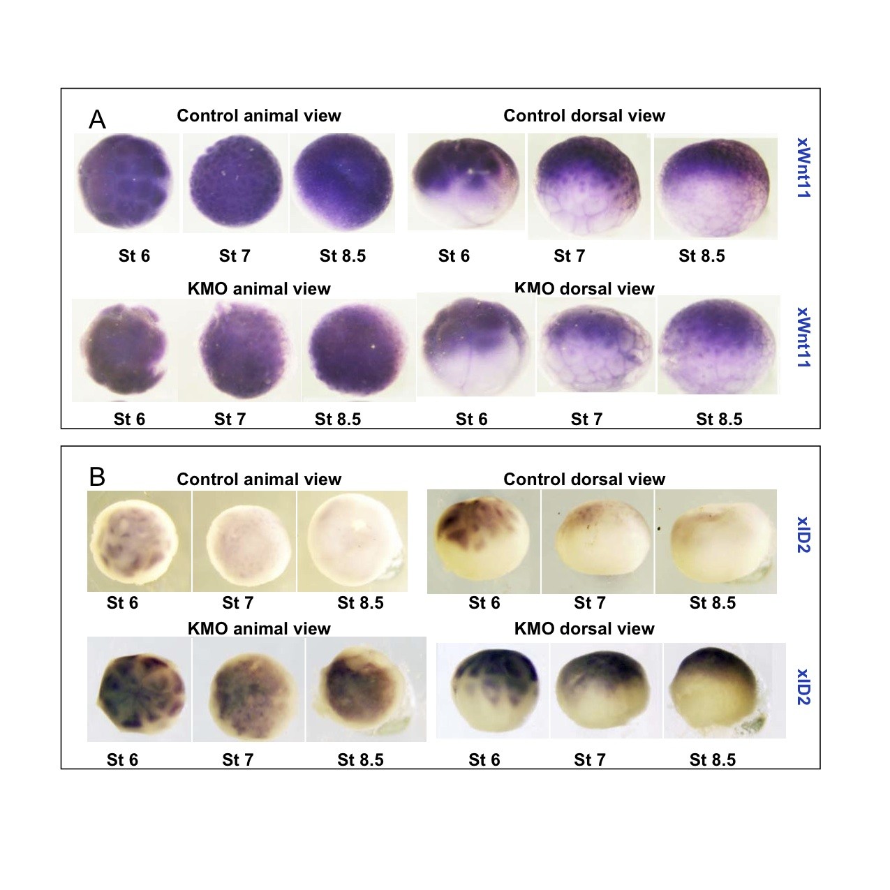 Fig. S7. No evidence for mis-expression of xWnt11 in xKaiso-depleted Xenopus laevis embryos. Whole-mount in situ hybridisation on control and xKMO Xenopus pre-MBT embryos using xWnt11 (A) or xID2 (B) probes. The stages of development are indicated. Animal and dorsal views are shown for every group of embryos. Note that only xID2 is ectopically expressed in pre-MBT xKMO morphants.