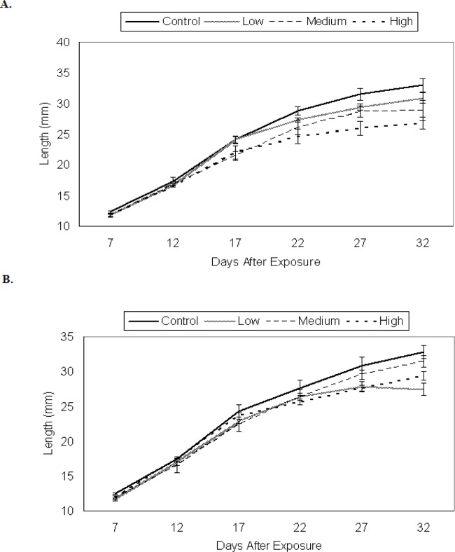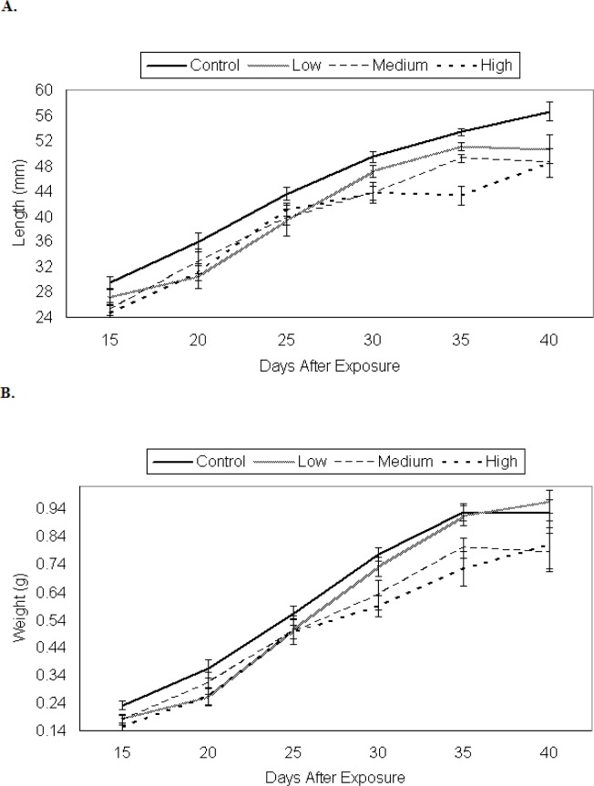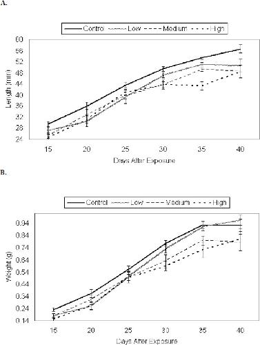 Figure 1. Larval growth of P. triseriata among control and 48 h TCDD treatments expressed as an increase in, a) total length (mm) and, b) weight (g) over time. Each data point represents the average length (± SE) of ten randomly selected larvae. Eggs were originally exposed for 48 h to waterborne concentrations of TCDD as follows: low (0.3 μg/l), medium (3.0 μg/l), and high (30.0 μg/l). Control P. triseriata were statistically longer, but not heavier than TCDD-treated larvae on the final sampling day (day 40)