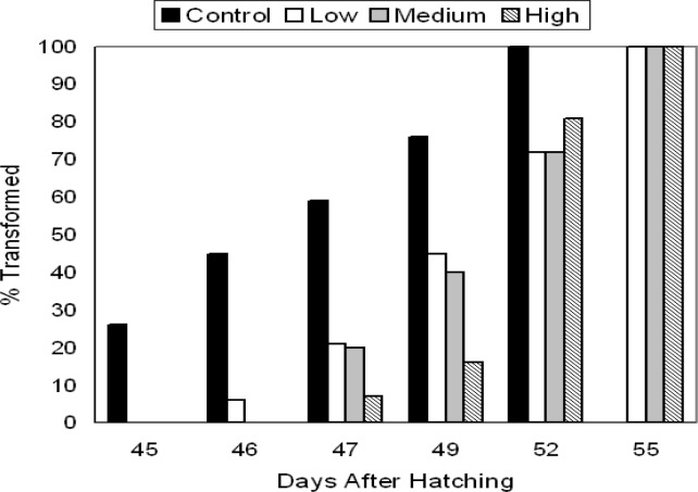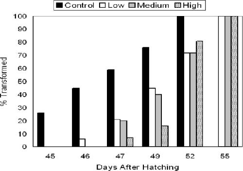 Figure 2:. Time (days) required for 48 h control and TCDD-treated P. triseriata larvae to reach metamorphosis. Control P. triseriata completed metamorphosis more rapidly than TCDD- treated animals. Eggs were originally exposed for 48 h to waterborne concentrations of TCDD as follows: low (0.3 μg/l), medium (3.0 μg/l), and high (30.0 μg/l).