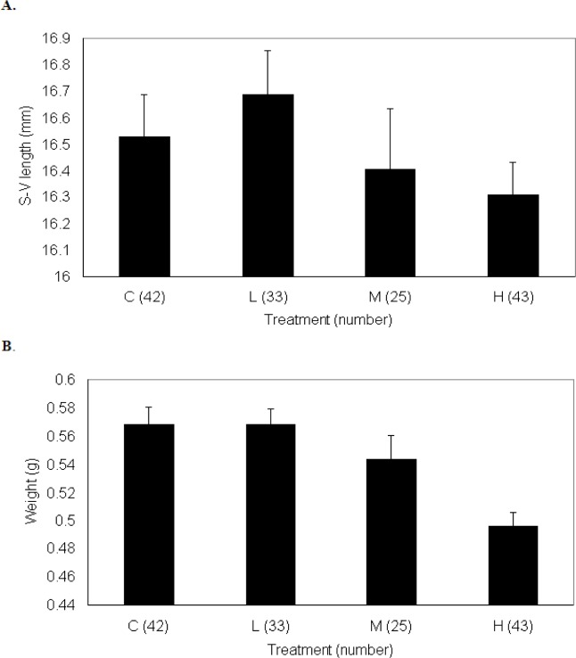 Figure 3. Size at metamorphosis of P. triseriata control and TCDD-treated animals measured in terms of, a) snout-vent length (mm), and, b) weight (g). Eggs were originally exposed for 48 h to waterborne concentrations of TCDD as follows: low (0.3 μg/l), medium (3.0 μg/l), and high (30.0 μg/l). *The number within parentheses represents the total number of metamorphosed frogs for each treatment.