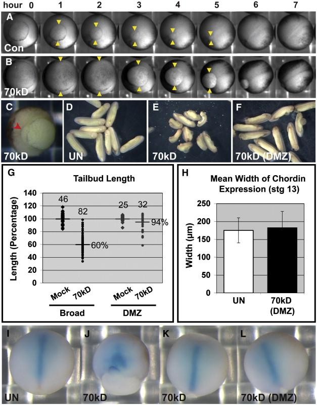 Fig. 4. Blastopore closure and epiboly but not axial extension are defective in embryos expressing 70 kD FN. (A, B) Time-matched frames from movies of blastopore closure in representative sibling embryos expressing control (Con) or 70 kD FN (70 kD) constructs. Yellow arrowheads mark the approximate diameters of the blastopores. (C) A representative 70 kD FN gastrula with delayed blastopore closure initiates a putative second blastopore lip (red arrowhead). (DâF) Tailbud stage embryos; (D) uninjected (UN), (E) injected with 70 kD FN into both blastomeres at 2-cell stage, or (F) into the marginal region of two presumptive dorsal blastomeres at the 4-cell stage (DMZ: dorsal marginal zone). (G) Quantification of 70 kD FN tailbudembryo lengths normalized to the mean length of mock injected (dextran only) tailbud embryos from each batch. The horizontal lines represent the mean tailbud lengths. Numbers of all tailbud embryos analyzed are listed above each group. (H) Quantification of the mean width of the axial marker Chordin from in situ hybridizations. Error bars are ± SD (n =  9â10). (IâL) In situ hybridizations after completion of gastrulation (stg. 13) showing localization of Chordin mRNAs. Axial elongation in embryos expressing (L) 70 kD FN in the DMZ are comparable to (I) uninjected embryos. Broad expression of 70 kD FN results in two phenotypes: (J) embryos that fail to complete blastopore closure show a wide pattern of Chordin expression, and (K) embryos that complete blastopore closure express Chordin in a similar pattern to uninjected controls.