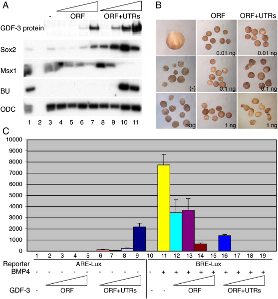 Fig. 1. Dose effects of GDF3 ORF and ORF plus untranslated regions (UTRs). Embryos were injected with increasing doses (1Â pg, 10Â pg, 100Â pg, 1000Â pg) of GDF3 RNA for the open reading frame (ORF) or the coding region plus UTRs (ORF + UTRs). (A) Top panel: western blot with goat anti-GDF3 of embryos injected with increasing doses of GDF3 constructs. Other panels: RT-PCR showing the effect of GDF3 constructs on cell fate. In lanes 1 and 2, whole embryo mRNA is shown with (1) and without (2) reverse-transcription is shown as controls for each marker gene. Lane 3 shows uninjected animal caps that express Msx1 (epidermis). Increasing doses of GDF3 induce Sox2 (neural tissue) and high doses of GDF3 ORF + UTRs induce BU (mesoderm). ODC is shown as a loading control. (B) Whole embryo (stage 17) or animal caps isolated at stage 9 and cultured until sibling stage 17. Caps were uninjected (â), injected with noggin RNA (200Â pg) or injected with increasing doses of GDF3 ORF or ORF + UTRs. Morphology of caps injected with 10, 100, 1000Â pg of each GDF3 construct are shown. (C) Luciferase assay using an Activin-responsive element (ARE-Lux) or a BMP-responsive element (BRE-Lux) driving luciferase reporters. For the BRE-Lux experiments, embryos were injected with BRE alone or with BRE and 100Â pg of BMP4 RNA to activate the reporter. Increasing doses (1Â pg, 10Â pg, 100Â pg, 1000Â pg) of GDF3 ORF or ORF + UTRs were injected with each reporter.
