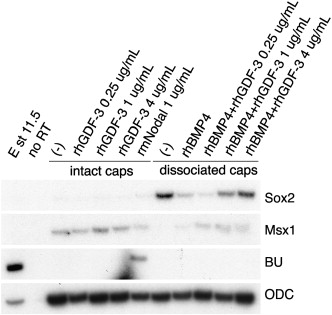 Fig. 3. Recombinant human GDF3 protein (rhGDF3) inhibits BMP activity in animal caps. Animal caps were isolated from stage 9 embryos and were cultured intact or were disassociated. The intact caps were treated with increasing doses of rhGDF3 or with recombinant mouse Nodal (rmNodal) to test for BU (mesoderm) induction. Disassociated caps express Sox2 (neural tissue) but treatment with BMP4 alone induces Msx1 (epidermis). Increasing doses of rhGDF3 protein antagonize BMP4 protein to revert the cells to a neural state. ODC is shown as a loading control. No RT is a control for genomic DNA.