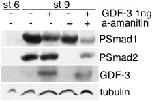 Fig. 2. Direct effects of GDF3 over-expression in frog embryos. GDF3 was injected with and without α-amanitin, which blocks protein translation. Embryos were harvested at stage 9 and analyzed for activation of BMP and Nodal signaling (Psmad1 and Psmad2, respectively). Stage 6 embryos are shown as a negative control for TGF-β activation, tubulin is shown as a loading control.