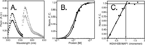 fluorescence plotted as a function of the ratio of H2A/H2B to yNap1. The