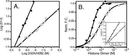squares are major type histone dimer. Inset of B is the