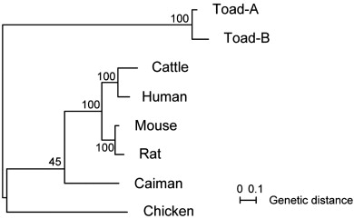 Nucleotide and translated amino acid sequences of toad-B cDNA clone. The indicators are the same as used in Fig. S1. The sequences can be accessed in the GenBank database under accession no. EU007688.