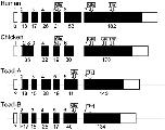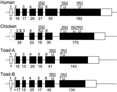 Structural organization of human, avian, and two toad IBSP genes. Exons are numbered according to the human IBSP gene. Coding lengths of exons with the number of amino acids are shown beneath the boxes. Open and shaded boxes indicate untranslated and translated exon regions, respectively. Exon 1 of the avian IBSP is illustrated by a box with dotted lines, because it was determined to be absent. The amino acid numbers of exon 1 of the toad genes are expressed as question marks, because it is unclear whether they are present. The letters ‘Glu’ and ‘Thr’ enclosed in the open boxes with arrows show the locations of the poly-Es and Thr-rich regions, respectively.