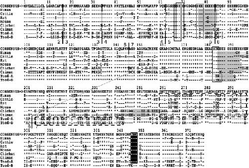 Amino acid sequence alignment of IBSP genes from human, bovine, rat, mouse, chicken, caiman, and toad specimens. Amino acid residues are shown with the IUPAC-IUB single letter code. Identity with the simple majority consensus sequence at the top is indicated by a dash (-) and deletions introduced for optimal alignment by asterisks (⁎). Vertical lines indicate exon borders of the human, chicken, and toad IBSP genes, and numbers on both sides of the line denote exon numbers. Dotted vertical line shows the cleavage site for eliminating signal peptides. The poly-Es are surrounded by grizzled boxes. The conserved signature for the phosphoserine motifs and the Thr-rich regions are indicated by open boxes with solid lines and dotted lines, respectively. The white letters on shaded backgrounds represent the conserved RGD sequences.