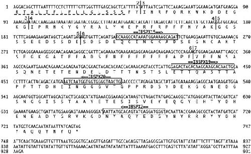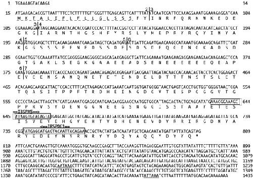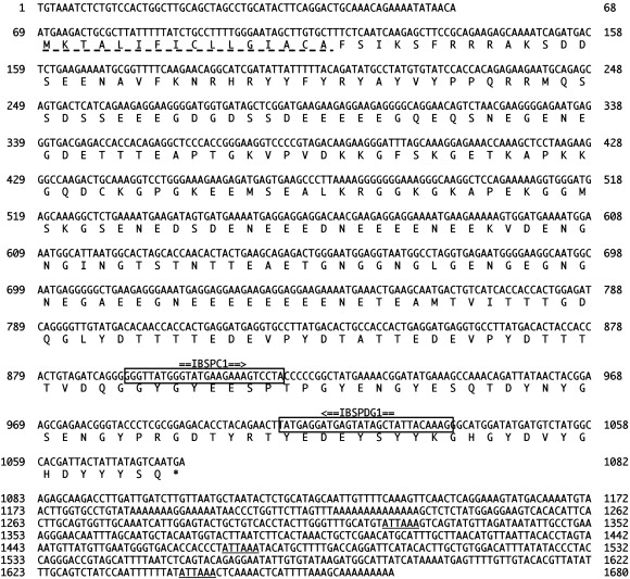 Nucleotide and translated amino acid sequences of caiman IBSP cDNA clone. Amino acid residues are shown with the IUPAC-IUB single letter code. The signal peptide is underlined with a dotted line. The stop codon is indicated by an asterisk (⁎) and polyadenylation signals are underlined with a solid line. Primer positions and orientations are indicated by double lines with arrowheads above their boxed locations in the sequence. The sequences can be accessed in the GenBank database under accession No. EU007686.