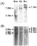 Southern blot analysis of the IBSP genes. Genomic DNA was digested with BamHI (Bam), BglII (Bgl), and EcoRV (Eco) restriction enzymes, then hybridized with the IBSP cDNA probe. (A) Caiman IBSP gene; genomic DNA derived from a spectacled caiman (Caiman crocodilus apaporiensis), which is a near relation of Paleosuchus palpebrosus, was used. (B) Toad IBSP genes.