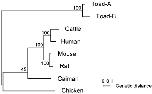 Neighbor-joining tree of amino acid sequences of IBSP proteins. The scale bar represents the distance based on the proportion of amino acid differences. Gapped sites were removed from all sequences before distance estimates were made. Numbers on the nodes indicate the percentage recovery of that node in 1000 bootstrap replications.