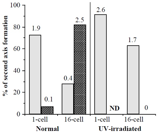 Specification of the dorsoventral axis is a subject of great importance in amphibian embryogenesis. We have found that cytoplasm of the vegetal dorsal cells of a 16-cell embryo of Xenopus laevis, when injected into the ventral vegetal cells of a recipient at the same stage, can induce formation of a second axis. In the present experiments,using the same assay procedure, we found that the cytoplasm around the vegetal pole of an egg before cortical rotation is also active in inducing a second axis,that the activity decreases throughout the second half of the cell cycle and appears in a presumptive dorsal equatorial region at the 2- to 16-cell stages. This is the first demonstration of the localization of dorsal forming activity in any specific region of an egg. After UV irradiation,a treatment that is known to block cortical rotation and thereby inhibit axis specification, the activity remains near the vegetal pole beyond the first cell cycle and does not appear in an equatorial region, at least at the 16-cell stage. This suggests that cortical rotation ora related force is in some way involved in changes in distribution of the activity.We also found that UV-irradiated 8-cell embryos can rescue dorsal development when they are cut into halves along the first cleavage plane. Histological examination revealed that the rescued embryos have a neural tube and notochord. In the half embryo, the animal and vegetal regions came into contact during wound healing, an event that enables the activity to localize in the new equator of an embryo. Therefore this rescue suggests that, if the activity is distributed only in the equatorial region, dorsal specification occurs. In fact, the dorsal side of the rescued embryos seems to correspond to the plane through which the embryos have been cut.Based on our results, we propose (1) that a determinant that carries axis-inducing activity is first present around the vegetal pole, (2) that the determinant shifts from the vegetal pole to an equatorial region by or in close association with cortical rotation and (3) that occurrence of the determinant in the equatorial region is a prerequisite for axis specification.
