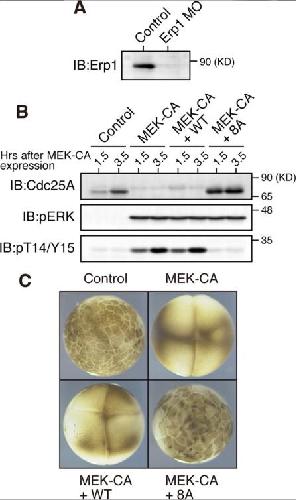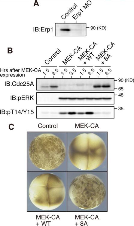 Figure 6. Cell cycle arrest in early embryos by ERK-induced Xe-Cdc25A degradation. (A) One-cell embryos 25 min after fertilization were injected with either water (Control) or 200 ng of Erp1 antisense morpholino oligos (Erp1-MO) and cultured for 1.5 h; embryo extracts were treated with λ-phosphatase and analyzed for endogenous Erp1 by immunoblotting. (B) One-cell embryos injected with Erp1 morpholino oligos as above were cultured for 35 min, injected with either water (Control), 5 ng of MEK-CA mRNA, or both 5 ng of MEK-CA mRNA and 200 pg of Myc-Xe-Cdc25A (WT or 8A) mRNA, cultured for the indicated times, and analyzed for Xe-Cdc25A (endogenous plus exogenous), phospho-ERK, and phospho-T14/Y15 by immunoblotting. (C) The embryos treated as in B were photographed 3 h after injection of MEK-CA mRNA (together with or without Myc-Xe-Cdc25A mRNA). Three and four independent experiments were performed for A and B, respectively, and, for each, a typical result is shown.