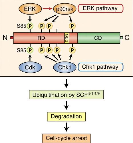The extracellular signal-regulated kinase-mitogen-activated protein kinase pathway phosphorylates and targets Cdc25A for SCF beta-TrCP-dependent degradation for cell cycle arrest.