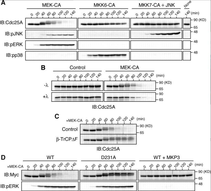 Figure 1. Induction of SCFβ-TrCP-dependent degradation of Xe-Cdc25A by the ERK pathway. (A) Artificially activated eggs (or eggs after 40 min of calcium ionophore treatment) were injected or not with 9 ng of JNK mRNA, reinjected 2.5 h later (time 0) with 9 ng of either MEK-CA, MKK6-CA, or MKK7-CA mRNAs, and analyzed at 20-min intervals by immunoblotting (IB) with anti-Xe-Cdc25A, anti-phospho-JNK, anti-phospho-ERK, and anti-phospho-p38 antibodies. (B) Activated eggs were injected with 9 ng of GST mRNA (Control) or MEK-CA mRNA. Egg extracts were then treated (+λ) or not (âλ) with λ phosphatase and analyzed for Xe-Cdc25A by immunoblotting. (C) Activated eggs were injected with 18 ng of GST mRNA (Control) or dominant-negative β-TrCPÎF mRNA, reinjected 2.5 h later with 9 ng of MEK-CA mRNA, and then analyzed for Xe-Cdc25A by immunoblotting. (D) Activated eggs were injected or not with 9 ng of MKP3 mRNA, reinjected 40 min later with 2 ng of mRNA encoding Myc-tagged WT or D231A Xe-Cdc25A, further injected 2.5 h later with 9 ng of MEK-CA mRNA, and then analyzed for Myc-Xe-Cdc25A constructs and phospho-ERK by immunoblotting. Five, three, four, and four independent experiments were performed for A, B, C, and D, respectively, and, for each, a typical result is shown.