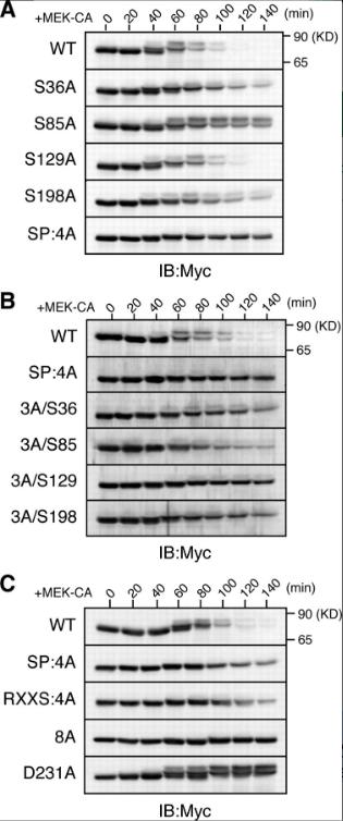 Figure 4. Requirement of ERK phosphorylation for Xe-Cdc25A degradation. (AâC) Activated eggs were injected with 2 ng of mRNA encoding the indicated Myc-Xe-Cdc25A constructs, reinjected 2.5 h later with 9 ng of MEK-CA mRNA, and analyzed for Myc-Xe-Cdc25A constructs by immunoblotting. In B, 3A/S36, etc., are reversion mutants of SP:4A (see text). Four independent experiments were performed for AâC, and, for each, a typical result is shown.