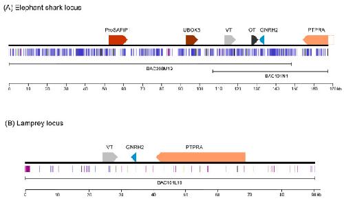 Figure 2. The neurohypophysial gene locus in the elephant shark (A) and Japanese lamprey (B). The BACs used for generating the sequences are shown below. Arrows represent genes and indicate the direction of transcription. Coloured vertical lines represent repetitive sequences. VT, vasotocin gene; OT, oxytocin gene; ProSAPiP1, proline rich synapse associated protein interacting protein 1; UBOX5, U-box domain containing 5; GNRH2, gonadotropin-releasing hormone 2; PTPRA, protein tyrosine phosphatase, receptor type, A.