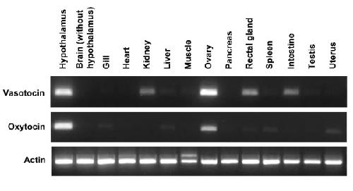 Figure 6. Expression patterns of elephant shark neurohypophysial hormone genes. Expression patterns of the elephant shark vasotocin and oxytocin genes as determined by semi-quantitative RT-PCR. Expression of actin gene was analyzed as a control for the quality of RNA and cDNA.