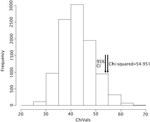 Figure 3. Distribution of Chi-squared Values Generated by Randomizing Disease Status.The chi-squared value obtained from empirical data is marked with an arrow, together with the 95% confidence limit.